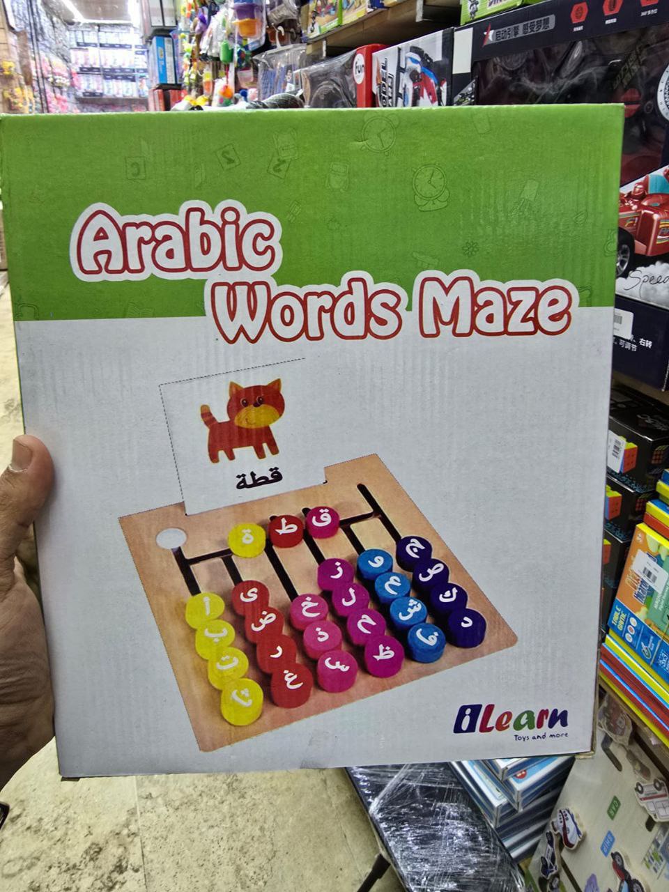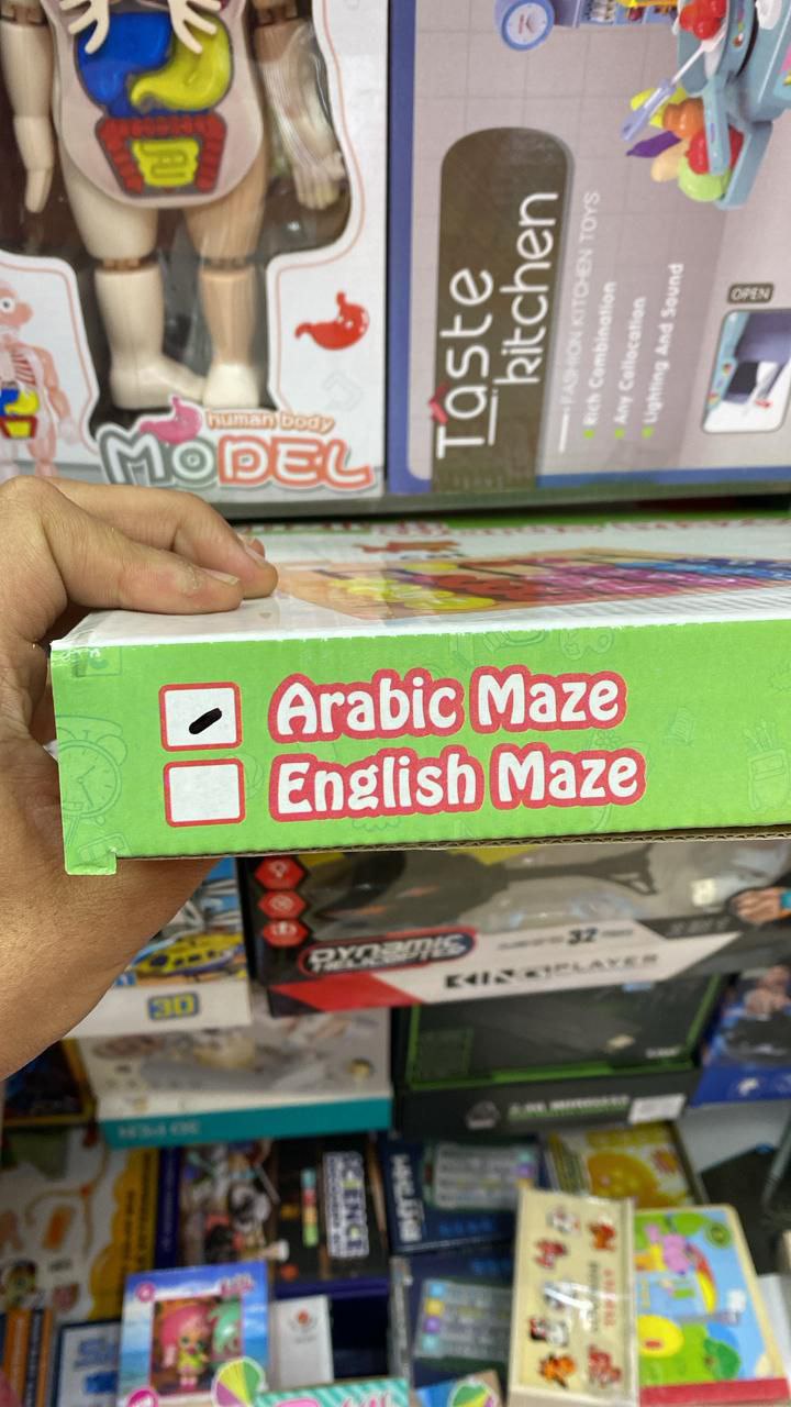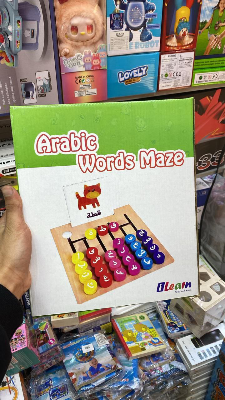 الطفل يشوف الصورة، ويحرك الحروف العربية الملونة داخل المتاهة الخشبية علشان يكوّن الكلمة الصحيحة.