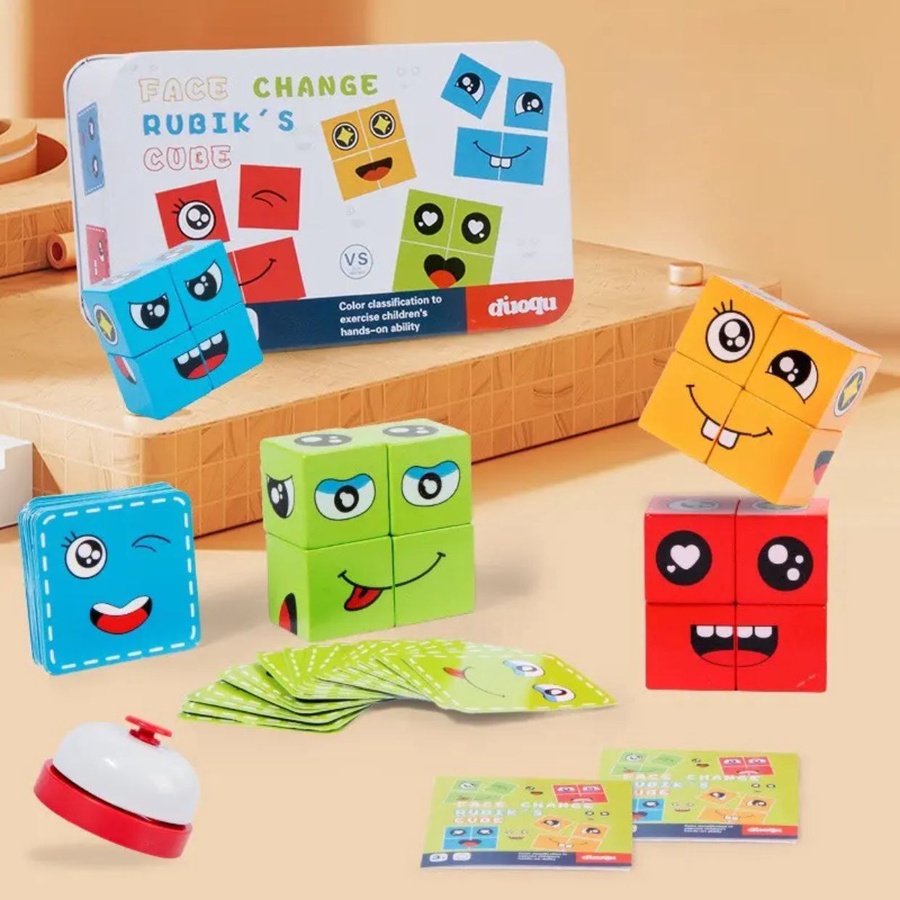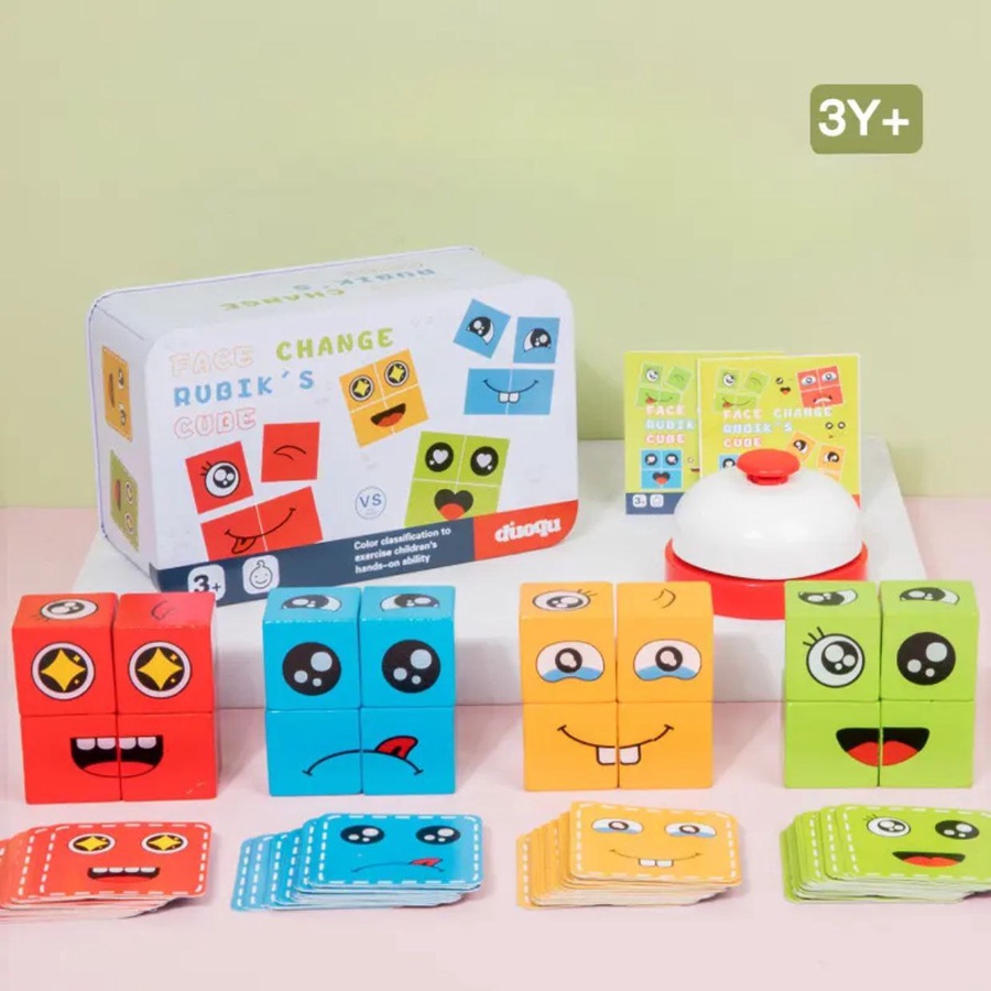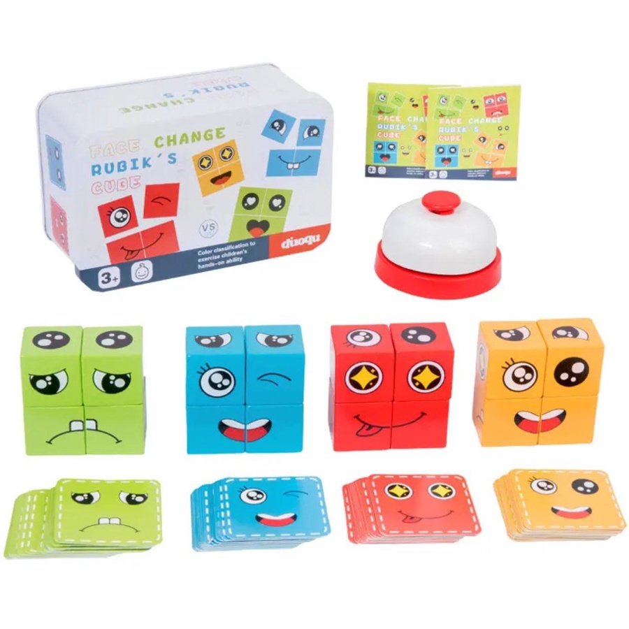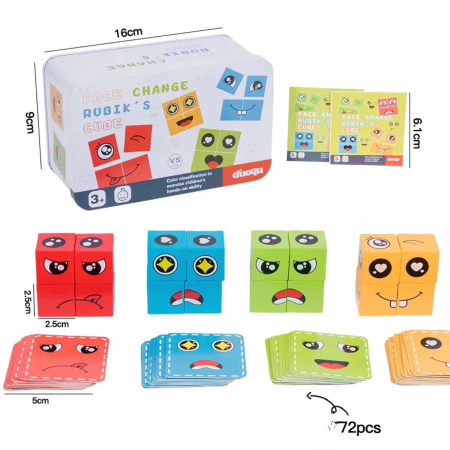 العلبة تحتوي على 4 مكعبات خشب سمايل و كروت بأشكال تعبيرات وجه (إيموجي) مختلفة، وتتيح للأطفال تكوين تعبيرات الوجه مثل حزين، فرحان، غضبان في أسرع وقت.