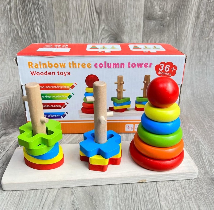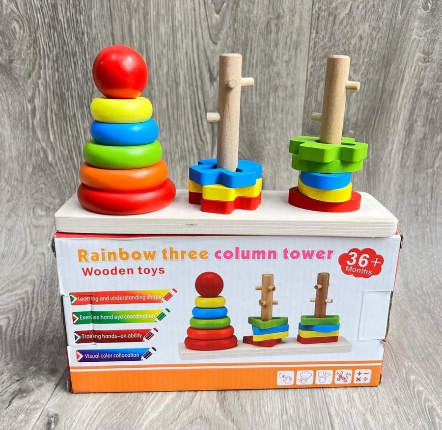 اللعبة تتكون من حلقة خشبية تتناسب مع أعمدة مختلفة الحجم، مما يساعد الطفل على التعرف على الألوان الأساسية و التمييز بينها.
