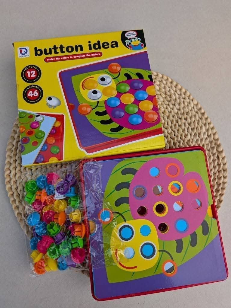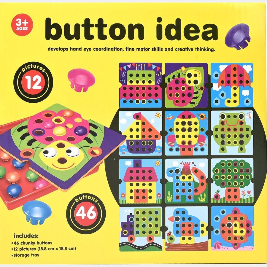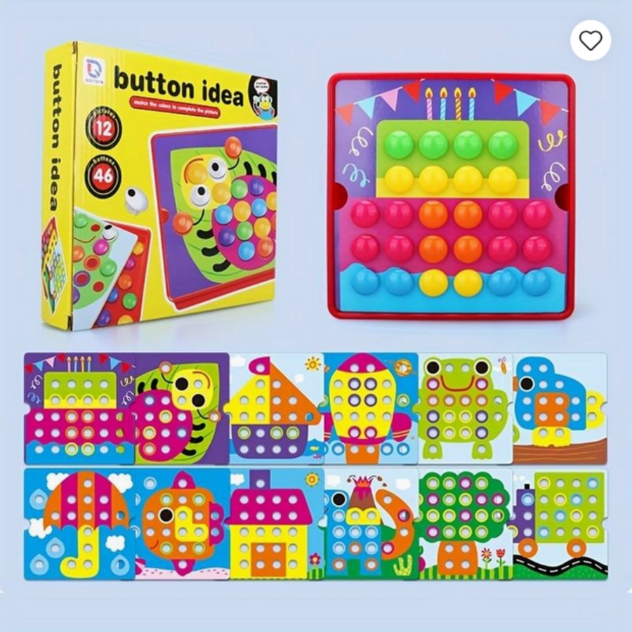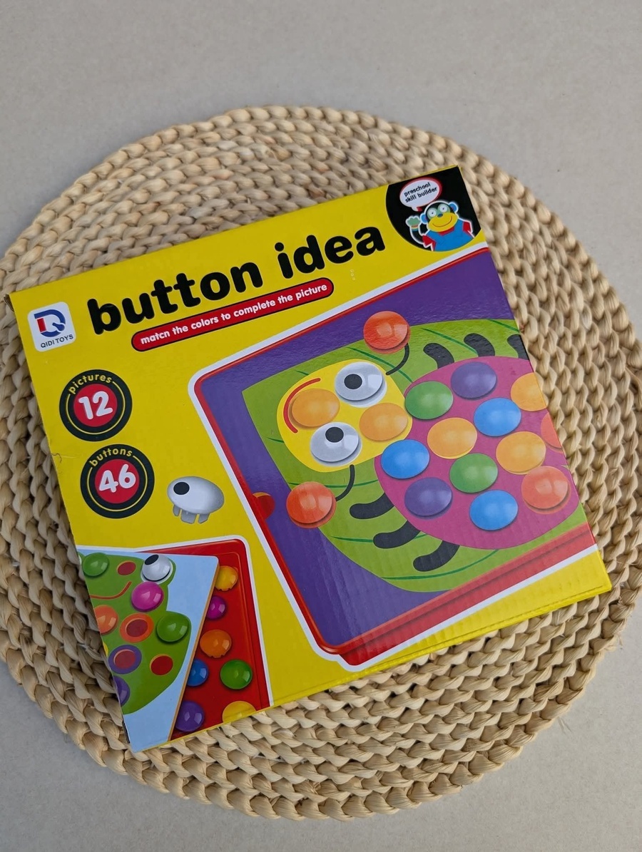 اللعبة تحتوي على 12 كارت كبار بأشكال كرتونية مختلفة مثل: أسد، بومة، سمكة، أرنب، عربية، زرافة، كابوريا وغيرها، ويأتي معها أزرار كبيرة وعيون.