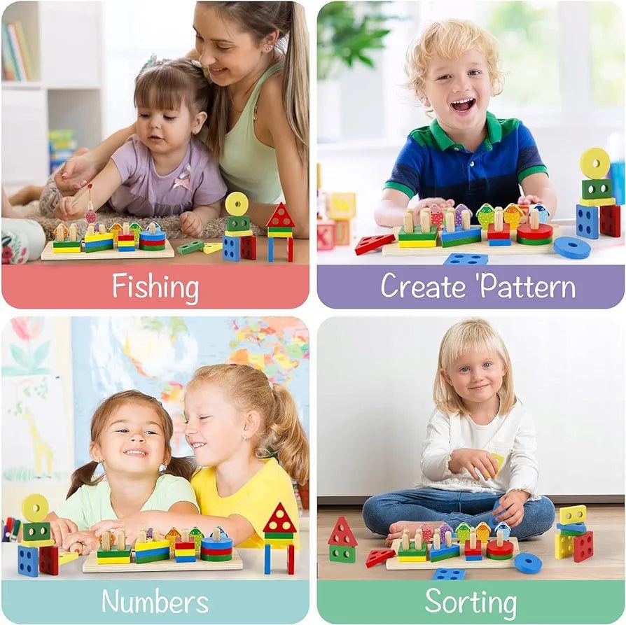 لعبة مطابقة أشكال + صياد سمك خشب هي لعبة 2 في 1 ممتعة وتعليمية للأطفال.